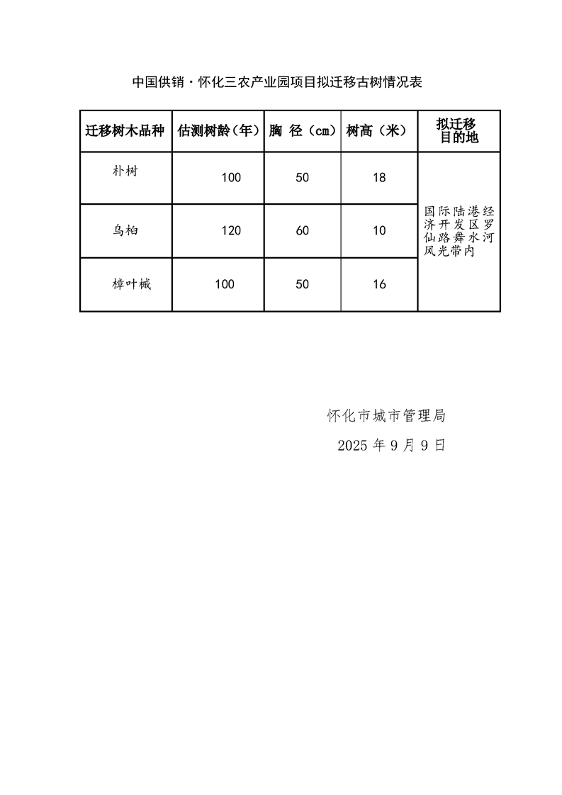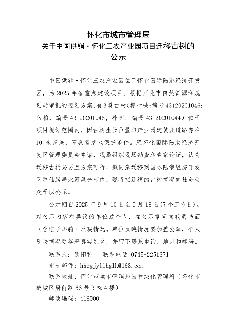 懷化市城市管理局關(guān)于中國供銷·懷化三農(nóng)產(chǎn)業(yè)園項目遷移古樹的公示