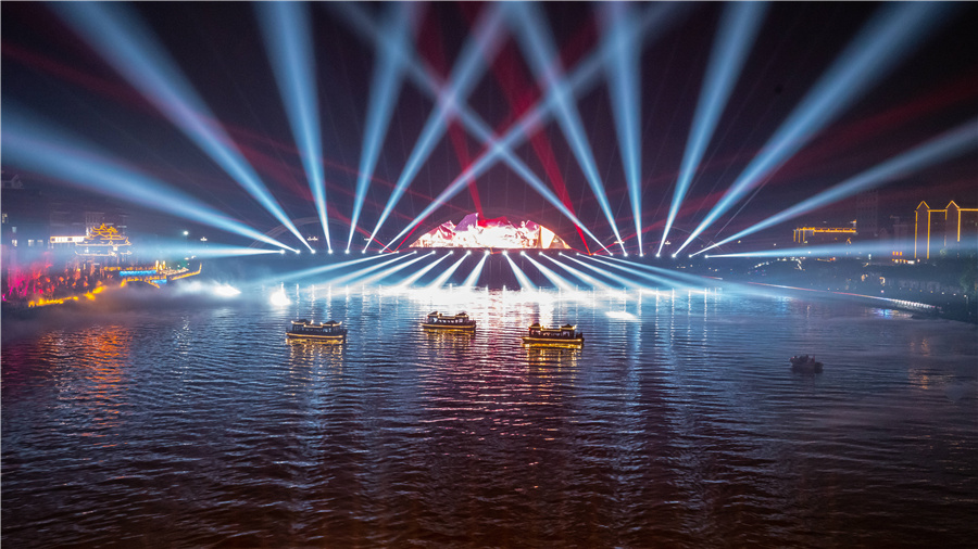 暮色四合,芷江和平湖上船影搖曳。兩岸燈火如星子傾落,水幕彩橋、巨幅光影、影像長(zhǎng)廊次第綻放,龍津風(fēng)雨橋、天后宮、萬(wàn)和鼓樓、索子街吊腳樓群等建筑仿佛披上流光霓裳,在夜色中煥發(fā)別樣神采。