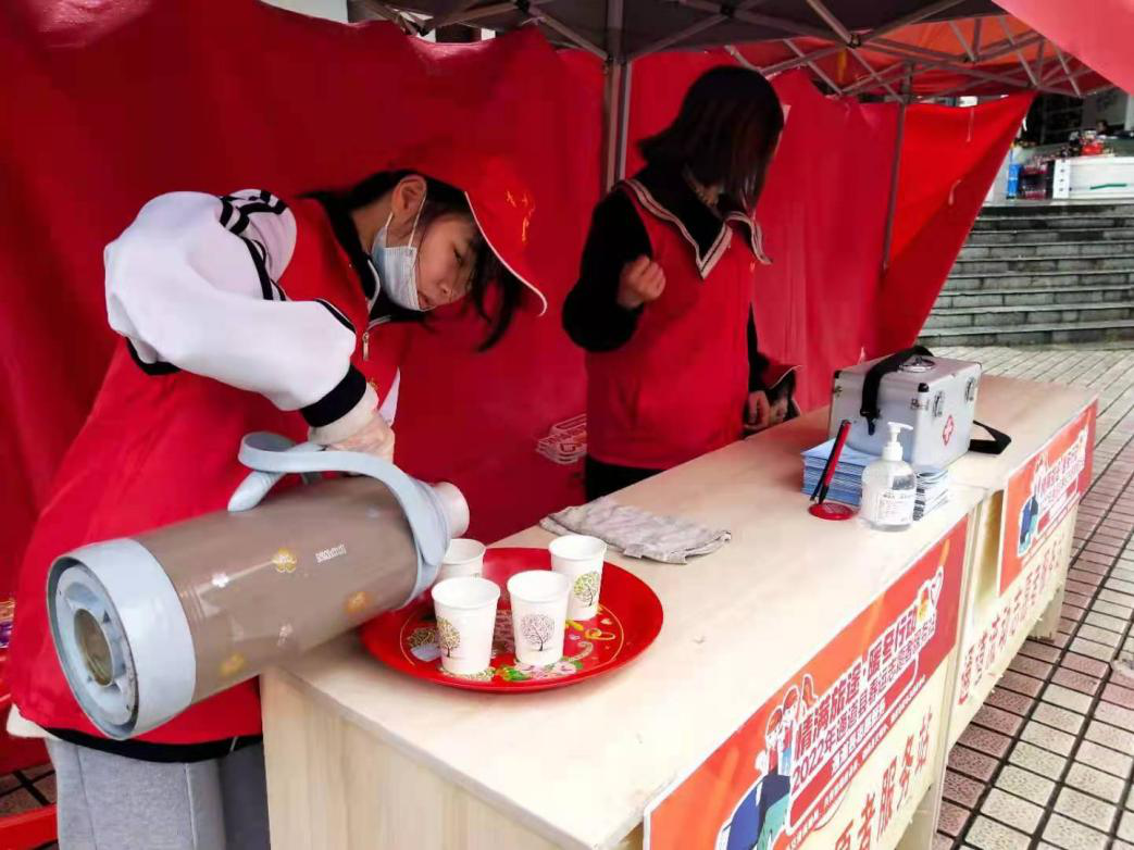 志愿者給出行群眾倒熱水